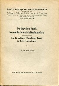 Heeb, Fritz: Der Begriff der Fabrik im schweizerischen Fabrikarbeiterschutz. Zur Gestalt des öffentlichen Rechts im Interventionismus. Aarau: H.R. Sauerländer 1939. Gr.-8°. 183 S. broschiert (Seiten nicht aufgeschnitten; altersgemäss gut erhalten) (=Zürcher Beiträge zur Rechtswissenschaft, Neue Folge, Heft 69; zugl. Dissertation Universität Zürich)