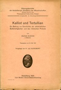 Koch, Hugo: Kallist und Tertullian. Ein Beitrag zur Geschichte der altchristlichen Bussstreitigkeiten und des römischen Primats. Heidelberg: Winter 1920. Gr.-8°. (4), 98 S. broschiert (Papier leicht gebräunt; ein Bogen leicht losgelöst; altersgemäss gut erhalten) (=Sitzungsberichte der Heidelberger Akademie der Wissenschaften, Philosophisch-historische Klasse, Jg. 1919, 22. Abhandl.).