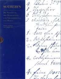 Die Sammlung der Markgrafen und Großherzöge von Baden. Versteigerung Baden-Baden 1995 bei Sotheby’s 7 Teile in 6 Bänden. Sotheby’s 1995. 4°. Insgesamt 1324 S., zahlreiche Farb- und sw-Abbildungen, Einleitung, Information, Versteigerungsbedingungen; gefaltete, große genealogische Tafel der Markgrafen und Großherzöge Broschiert in Schuber (gut erhalten) Band 1: Möbel, Uhren und Tapisserien – Band 2: Kunstkammer – Band 3: Keramik und Glas – Band 4: Möbel und Dekorationen – Band 5: Gemälde und Druckgraphik – Band 6: Europäische und Orientalische Keramik und Glas – Band 7: Einleitung, Information, Versteigerungsbedingungen; gefaltete, große genealogische Tafel der Markgrafen und Großherzöge.
