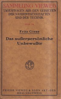 Giese, Fritz: Das ausserpersönliche Unbewusste. theoretische Bemerkungen zum intuitiven Denken. Braunschweig: Fr. Vieweg & Sohn 1924. 8°. VI, 105 S., Broschiert (Seiten nicht beschnitten; altersgemäss gut erhalten) (=Sammlung Vieweg, H. 72)