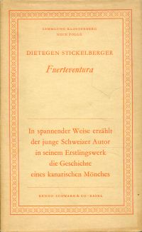 Stickelberger, Dietegen: Fuerteventura. Erzählung von d. Kanarischen Inseln. Basel: Schwabe 1954. 8°. 135 S. Pappband (Schutzumschlag hinten mit Einrissen und angebräunt; sonst gut erhalten) (=Sammlung Klosterberg : N.F.) In spannender Weise erzählt der junge Schweizer Autor in seinem Erstlingswerk die Geschichte eines kanarischen Mönches.