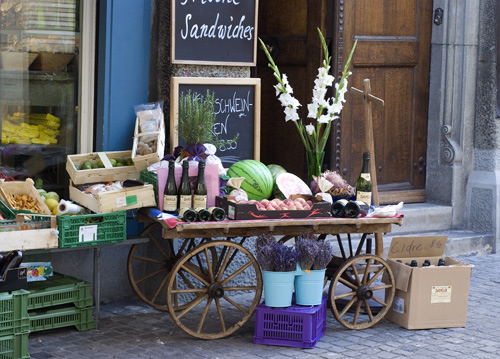 bildreich karten PK 628: helens arrangement. Querformat. (Laden, Auslage, Leiterwagen, Helen, Neumarkt, Tante Emma, Gladiolen) Mindestbestellmenge: 15 Karten (auch assortiert).